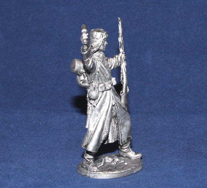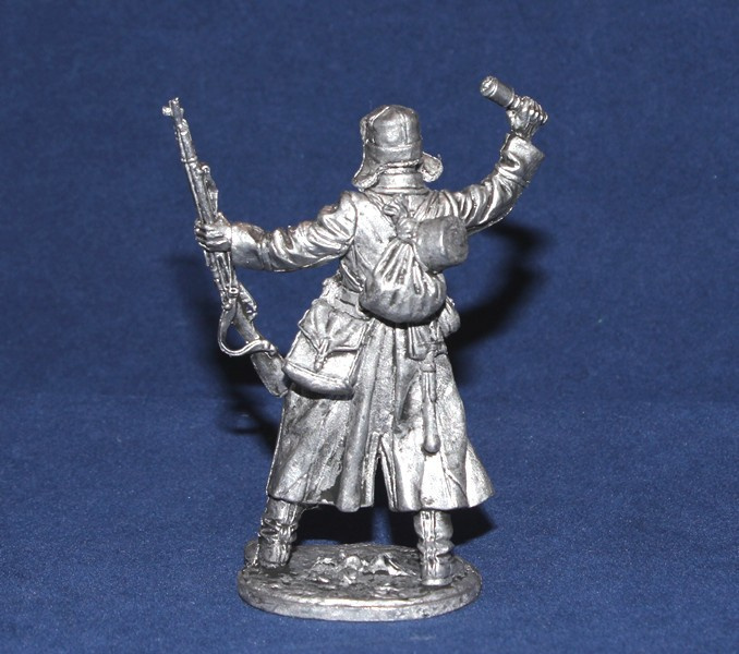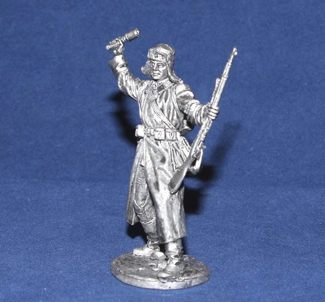 WWII-084 Оловянная фигура Боец РККА в шинели с гранатой, 1941-43гг. СССР, 54мм