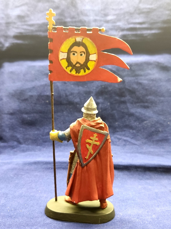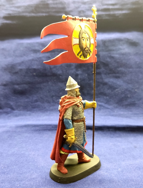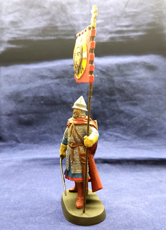 MMW0009clr Окрашенная оловянная миниатюра Новгородский ратник с флагом 10в., 54 мм