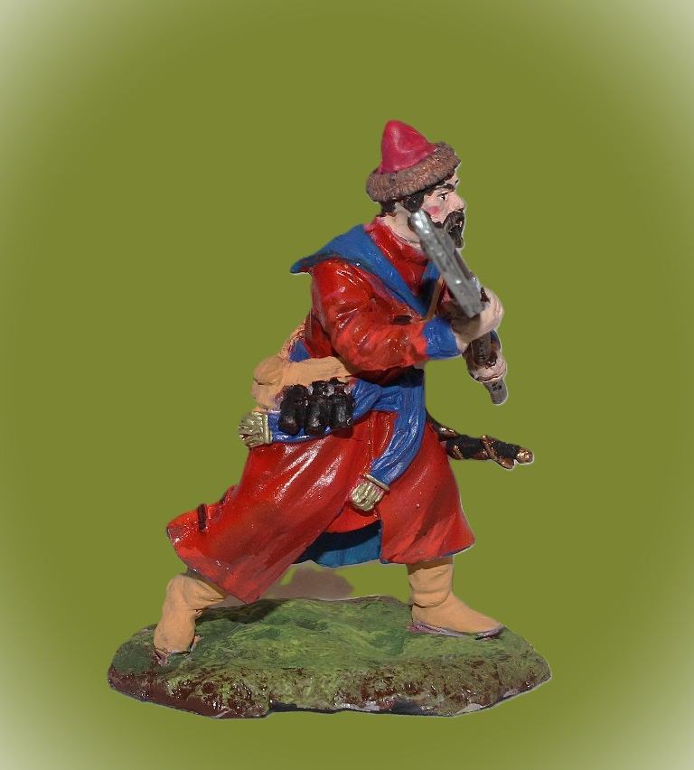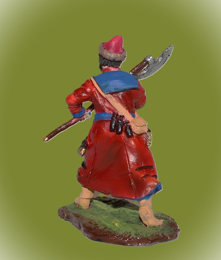 MMW0065clr Окрашен.оловянная миниатюра Стрелец княжеской дружины №4 бежит с бердышом 15в-16в , 54 мм