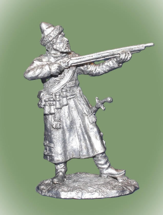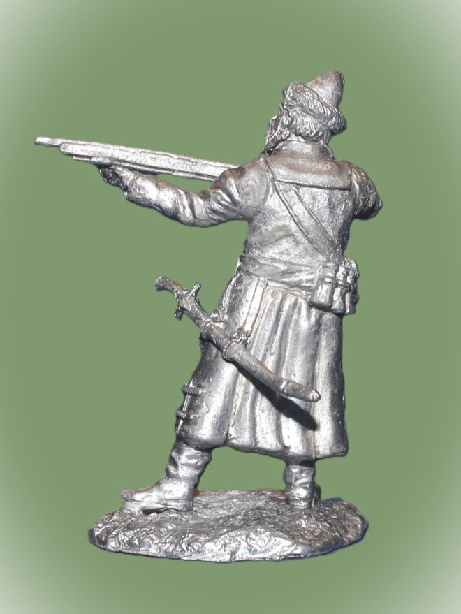 MMW0064 Оловянная миниатюра Стрелец княжеской дружины, стреляющий из мушкета №5, 15в , 54 мм
