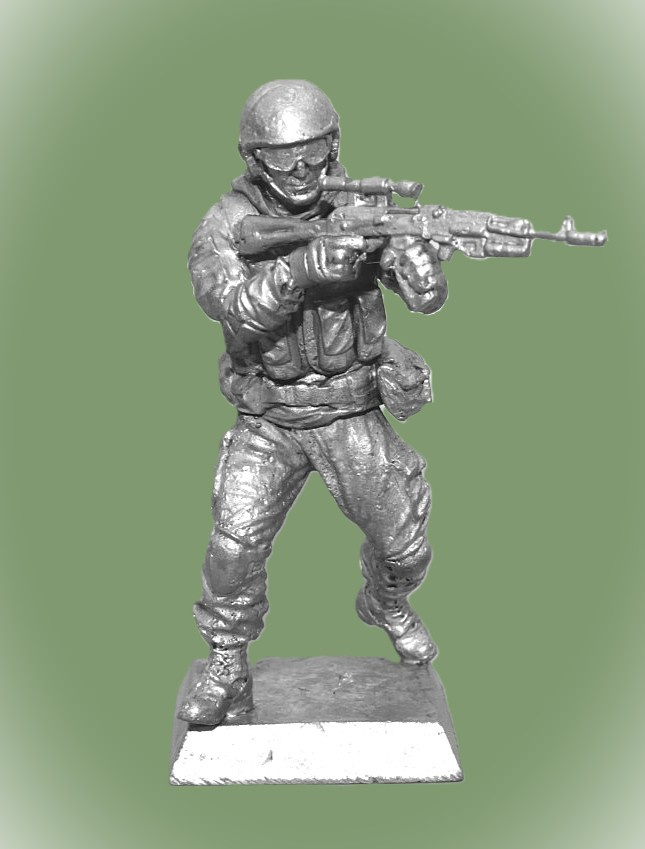 СНРФ16 Оловянная миниатюра Боец спецназа РФ в очках, бежит с АКС-74 с прицелом, 54 мм