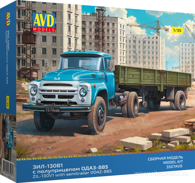3507AVD Сборная модель Автомобиль ЗИЛ-130В1 с полуприцепом ОДАЗ-885, 1/35